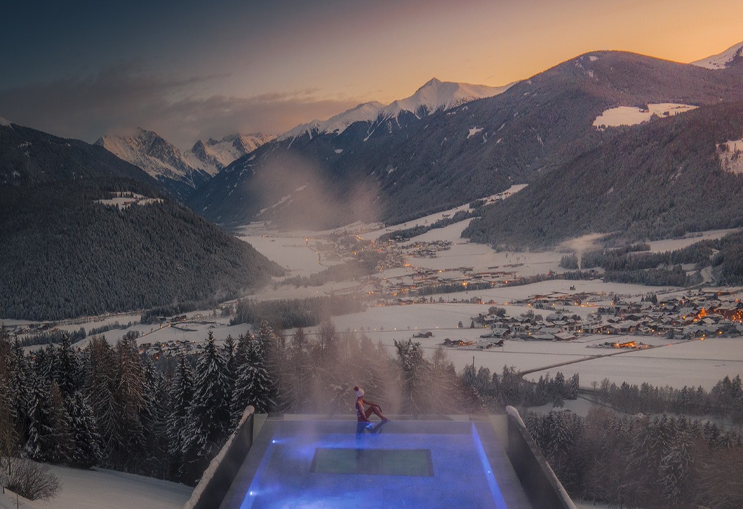 In the South Tyrol’s Dolomite mountains, design-led Hotel Hubertus sits suspended between earth and sky, with its gravity-defying Skypool and iconic Heaven & Hell Sky Spa promising soaring peaks and snow-strewn horizons. Set high above the Puster Valley, three minutes from the valley station via private shuttle, it combines elevated dining and exceptional spa offerings with seamless access to Plan de Corones/Kronplatz’s pristine slopes. With over 120 kilometers of runs, from gentle greens to the legendary Black Five, the mountains offer experiences for all abilities, as well as the thrill of night skiing under a canopy of stars. For those that tire of the slopes, the spa beckons with its panoramic whirlpools and mountain views, infinity pool, saunas, revitalising rain showers and five further pools. The hotel itself offers a robust program of winter events, including everything from sophisticated wine tastings to alpine hut parties, and ski safaris to energising winter hikes.